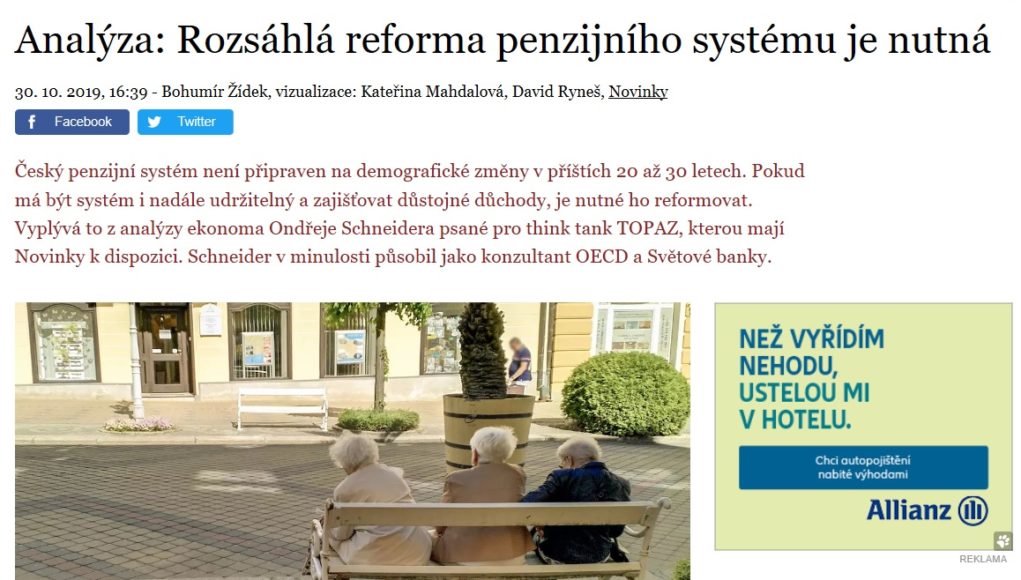 Český penzijní systém není připraven na demografické změny v příštích 20 až 30 letech. Pokud má být systém i nadále udržitelný a zajišťovat důstojné důchody, je nutné ho reformovat. Vyplývá to z analýzy ekonoma Ondřeje Schneidera psané pro think tank TOPAZ, kterou mají Novinky k dispozici. Schneider v minulosti působil jako konzultant OECD a Světové banky.