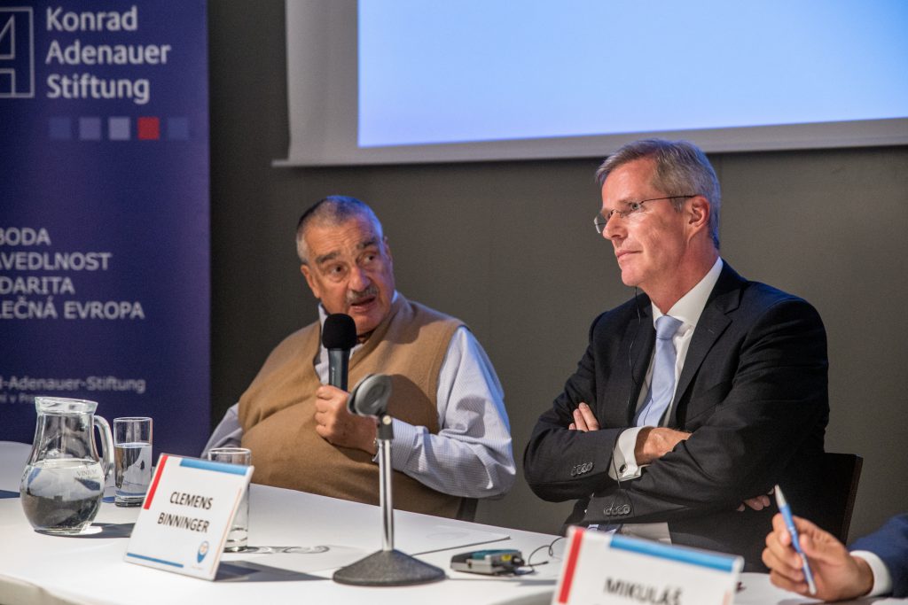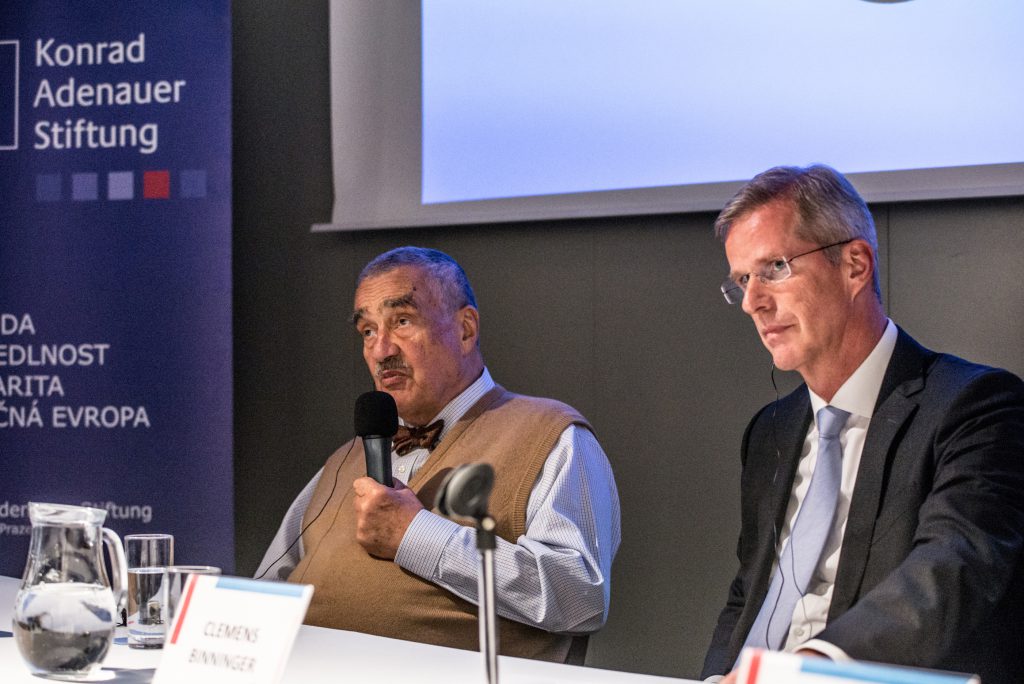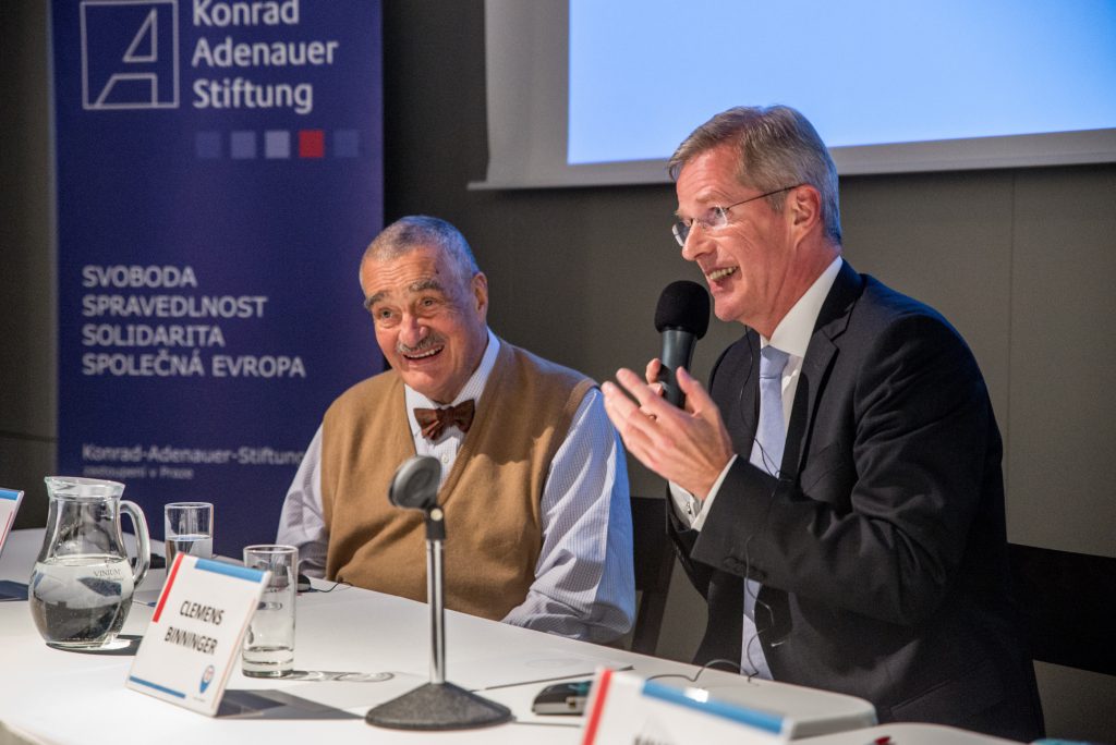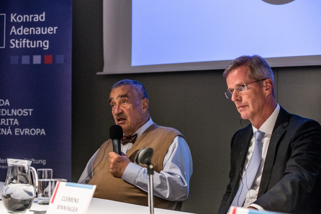 Na první panelu, který moderoval Marek Ženíšek, vystoupili bývalý slovenský premiér a dnes prezident Wilfried Martens Centre for European Studies Mikuláš Dzurinda, čestný předseda TOP 09 Karel Schwarzenberg, a Clemens Binninger, bývalý poslanec německého Bundestagu a bezpečnostní expert CDU.